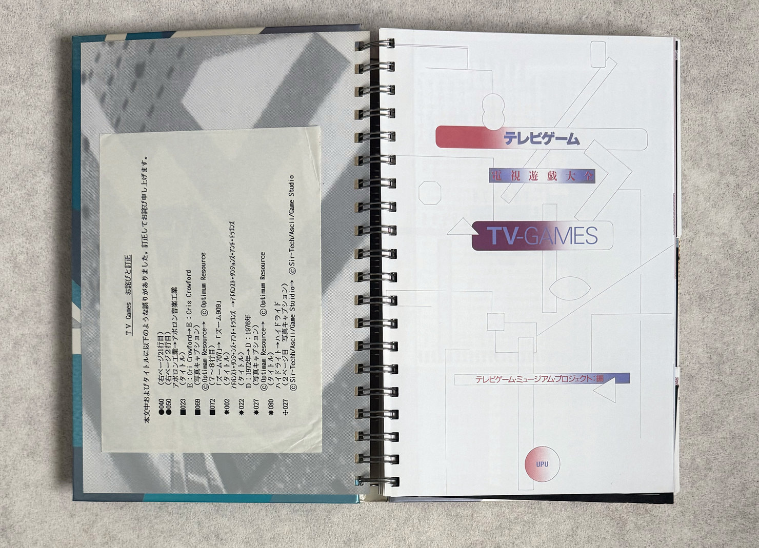 The following year, the team behind TV’s TV channelled that same energy into print. The result might be described as a book, but it’s much more than that. テレビゲーム―電視遊戯大全 (TV GAMES: Denshi Yūgi Taizen; TV Games Encyclopedia), published in May 1988 by UPU, ISBN4-946432-31-0, was a seminal encyclopedia of video game history—and perhaps the single most ambitious book about games ever produced.