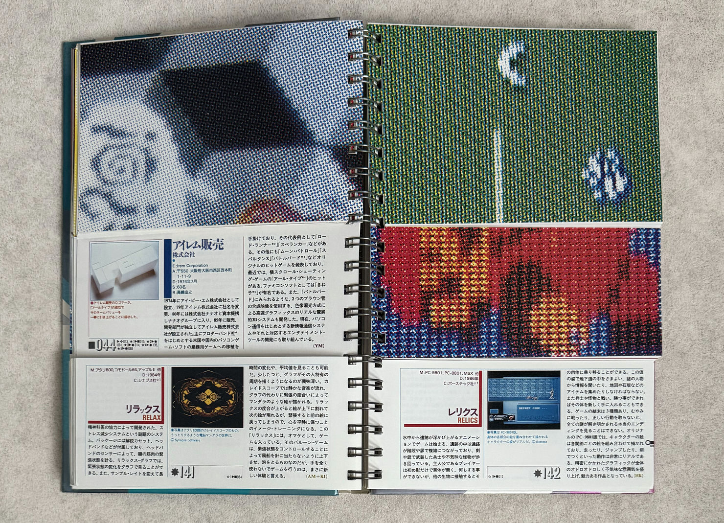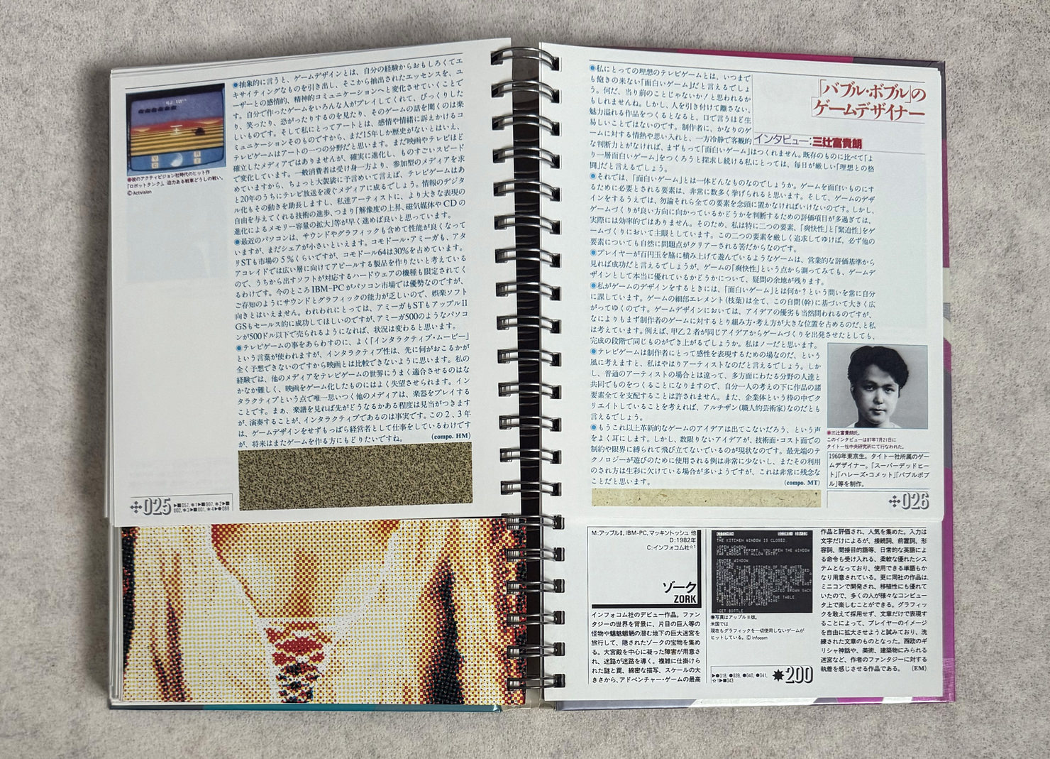 Because every page is physically split into three sections—and each section carries jump signs pointing to related content elsewhere—you don’t read the book linearly. You follow threads. Top section might be history, middle section a company profile, bottom section a game entry, and the cross-references send you bouncing between all three. It is, in the most literal sense, a hypertext document published five years before Mosaic.